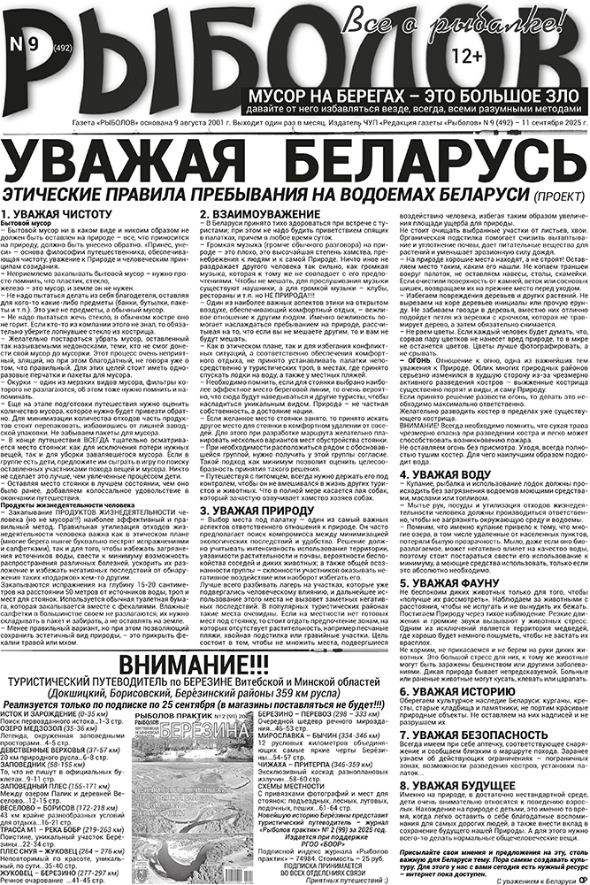 Актуальные вопросы рыбалки и отдыха на Озерах и Реках БЕЛАРУСИ газете «Рыболов» № 9 за август 2025 год